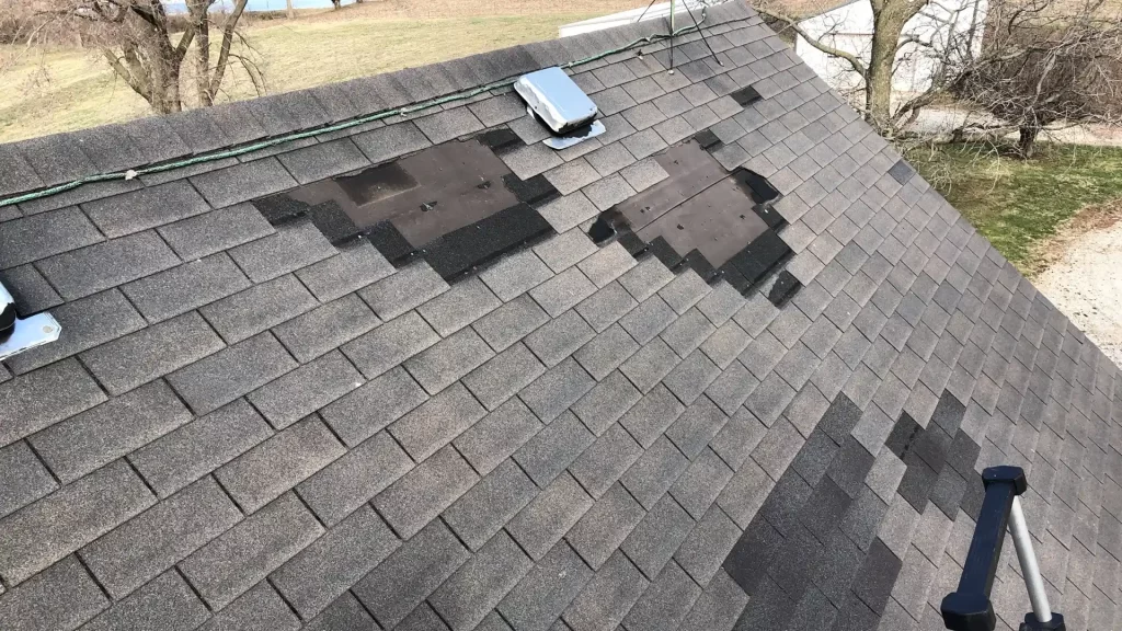Exposed roof deck is vulnerable to water damage. Schedule a roof repair promptly to prevent leaks and further deterioration.